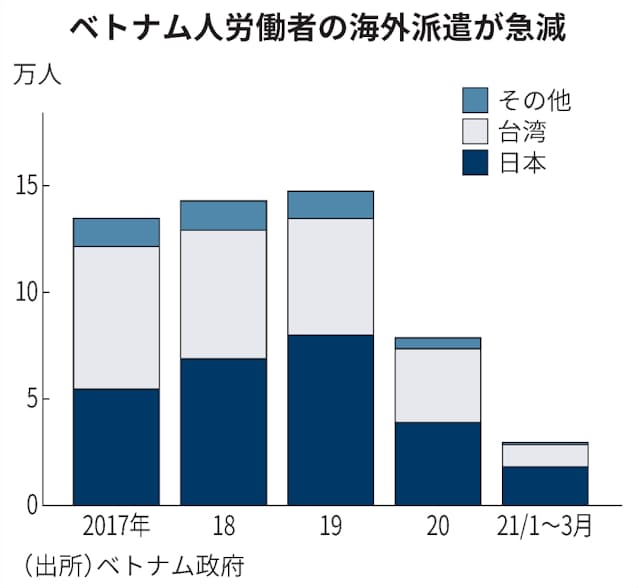新型コロナウイルスの感染拡大で、ベトナムから海外への人材派遣が大幅に減少している。派遣人数の過半を占める日本のほか、19日から台湾も外国人の新規受け入れを停止した。ベトナム政府は2025年までの5年間で50万人を派遣する方針だが、実現を危ぶむ声が強まっている。