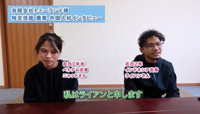 弊社の公式YouTubeチャンネルにて、新しい動画「農業分野で働く特定技能外国人材インタビュー」を公開いたしました。今回の動画では、実際に日本の農業現場で「特定技能」として活躍している、ベトナム出身のニャットさんとインドネシア出身のライハンさんにお話を伺いました。