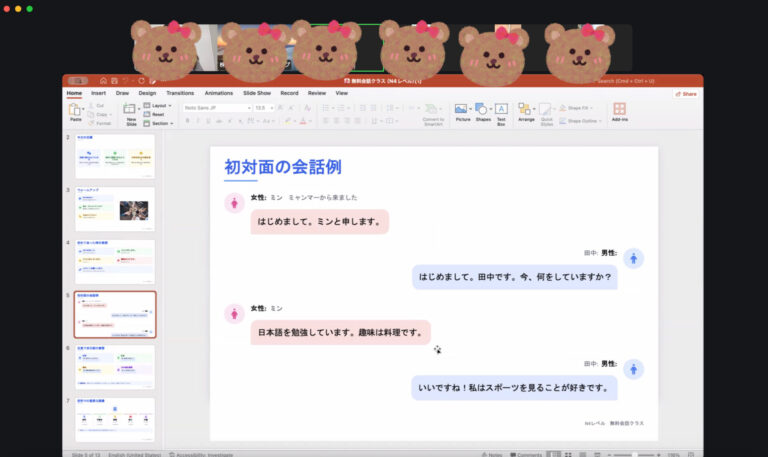 参加者👩:日本語を勉強しています。日本人の先生と会話の練習をしています。趣味は料理を作ることです。