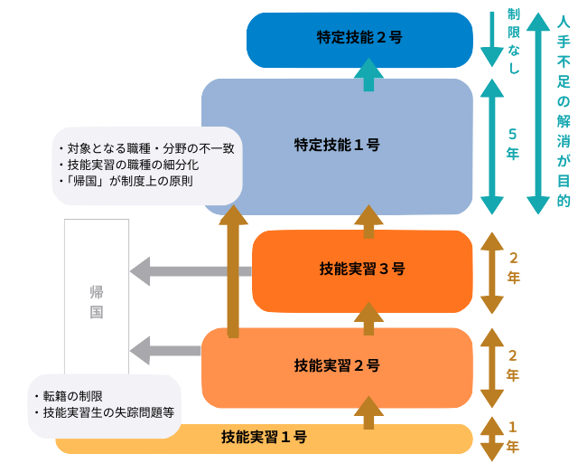 | キャリアバス | 原則として日本の技術を学び母国に還元することが目的。在留期間終了後は帰国が基本。 | ・特定技能1号: 技能水準を測る試験に合格し、特定技能2号への移行が可能。 ・特定技能2号: 熟練した技能を持つ者として、永住の道が開ける。家族の帯同も可能。 |